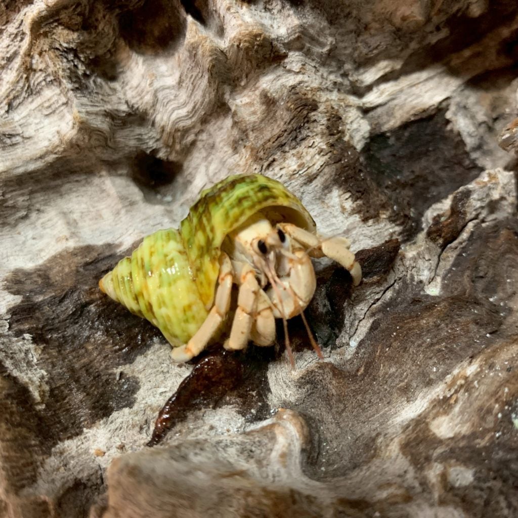 緑サザエにお着換えしている白っぽいオカヤドカリさん【Sサイズ】+貝殻1個 +ガジュマル+ヤシの葉+海綿3点+天然海水+餌サンプルセット【写真のヤドカリさん】