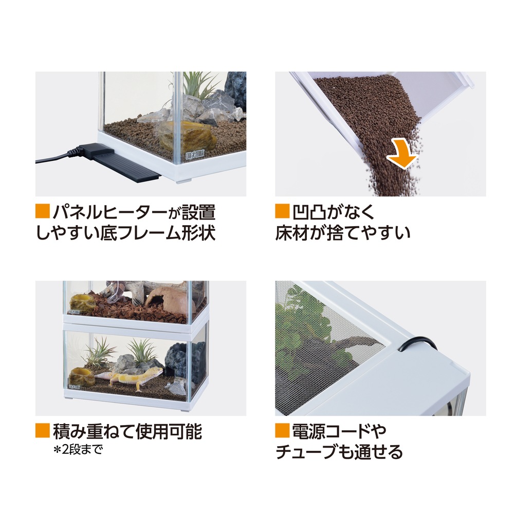 セット内容:レプテリアツインビュー300ホワイト、レプタイルヒートXS、アナログ温度計、ウォーターディッシュXS、モイストシェルターコーナー90、デザートソイルお試し800g